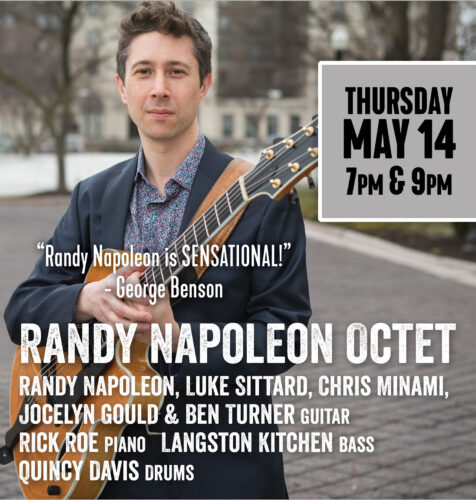 Celebrating the release of his 12th album ‘Waking Dream’, guitarist Randy Napoleon brings his Octet to Kalamazoo. Currently an Associate Professor at Michigan State University and Associate Director of Jazz Studies, Napoleon cut his teeth touring with pianist Benny Green, The Clayton-Hamilton Jazz Orchestra, Michael Bublé, and a thirteen year tenure with Freddy Cole. Napoleon has performed or arranged on over seventy records including the Grammy-nominated releases, Freddy Cole Sings Mr. B and My Mood Is You. He performed on The Clayton Hamilton Orchestra: Live at MCG, and is featured on Buble’s Grammy-nominated recording Caught in the Act. Television credits include The Tonight Show, Late Night With David Letterman, The View, and the Today Show and live performances span the globe including Royal Albert Hall, The Sydney Opera House, The Hollywood Bowl, and Lincoln Center.